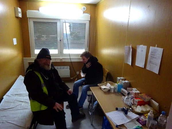 | Problematisch war ein junger zusammengebrochener Syrer, aus dem herauszubekommen war, dass er vor einem Jahr einen Bombenangriff mit 100 Toten überlebt hat. Das war zum Glück nur einer – man stelle sich vor, nach einem Angriff würde die Straße voll von solchen Menschen sein … Er wollte ins Krankenhaus, und das konnten wir auch organisieren. In diesen Fällen fordern die Hamburger Krankenhäuser und Krankentransport-dienste derzeit keine Krankenversicherungsnachweise. | ||||