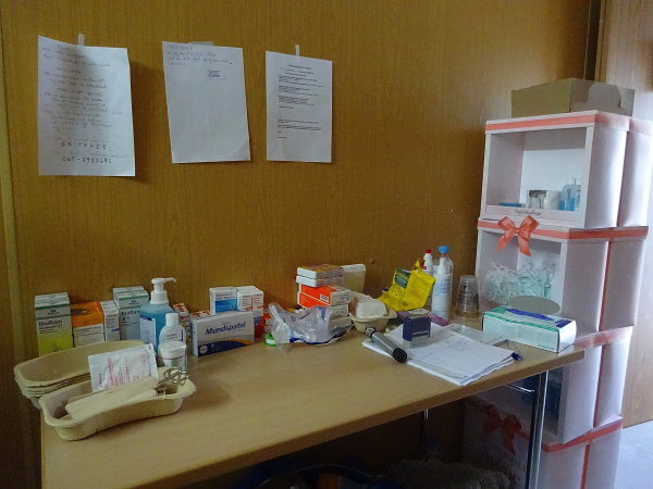 | Die zu untersuchenden Kinder kriegen alle erstmal ein Spielzeugsanitätsauto, das finden sie toll. Ich lasse Fieber messen, höre sie ab, gucke in den Hals und taste sie soweit als notwendig ab, mehr braucht’s nicht. Und mehr als Hustenbonbons und manchmal Aspirin (für die Erwachsenen) haben wir auch nicht zu verteilen. Hätten wir Antibiotika gebraucht, wär’s umständlich geworden, aber machbar. | ||||