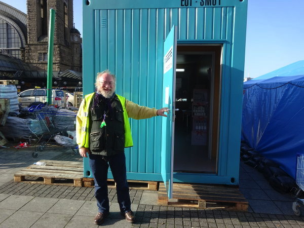 | Viele der in Hamburg Gelandeten wollen nach Schweden weiter, die meisten weil sie dort schon Angehörige haben. Unter der Treppe werden sie beraten, bekommen etwas neue Kleidung wo nötig, und Familien bzw. Bedürftige werden vor den Bahnhof zum Zelt geleitet, wo sie zu essen und zu trinken bekommen. Nur Familien mit Kindern dürfen ins Zelt, sonst wird’s zu voll, der Rest campiert draußen (der Platz ist überdacht). | ||||
