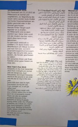 | In Teilen des Sendegebiets wurde die Knallerei in der Nähe von Flüchtlingsunterkünften verboten. Den umgekehrten Weg geht die Gemeinde Reichenberg bei Würzburg, die nach vorheriger Information der Betroffenen ein Probeböllern vor einer Unterkunft veranstaltet: | ||||