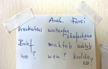 | Unsere Dolmetscher/innen, die uns Migranten in Aktion schickt, sind zwar sehr engagiert, aber wenn sie Farsi sprechen, kommen meistens arabischsprachige Patienten und umgekehrt. Die vom Mittwoch sprach jetzt Farsi, und die Patientin arabisch. Die syrischen Helfer, fast alle junge Männer, die gebrochen Deutsch oder Englisch sprechen, sind bei einer Frau und diesem Thema keine große Hilfe, also bastelte ich mir einen Spickzettel, gleich zweisprachig, weil demnächst vielleicht arabische Dolmetscherin und afghanische Patientin. | ||||