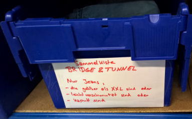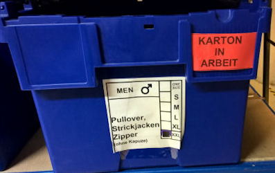 … in das die aus den Pappkartons heraussortierten Kleidungsstücke nach Art und Größe hineingestapelt werden. Ist der Karton voll, wird er geleert und die Sachen abgezählt in einen Pappkarton gepackt. Dabei kann man sich leicht verzählen, dann muss alles nochmal raus und nachgezählt werden, und geschlossen werden darf er erst, wenn er richtig voll ist. Bei einer Ladung „Hemden Langarm Größe L“ dauerte das ewig, weil Karton zu groß und Hemden relativ wenig Platz einnehmend. Und wenn der Karton nicht richtig voll ist, knautscht er zusammen und geht womöglich kaputt. In diese Kiste kommt erstmal nix mehr rein, … |