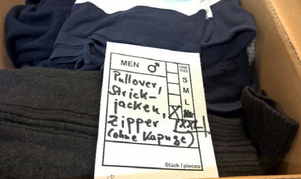 | Nach der Begrüßung kriegt jeder sein Tesakrepp-Namensschild, und ich schnappe mir die erste Pappkiste mit unsortierten Männerklamotten – seit unserem letzten Besuch ist der Stapel ordentlich gewachsen: | ||||