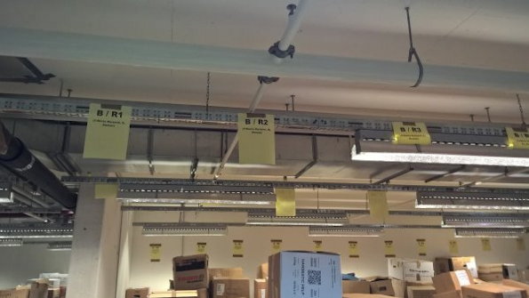 Damit man die jeweiligen Kisten vor der LKW-Verladung wieder findet, gibt's Deckenmarkierungen. |