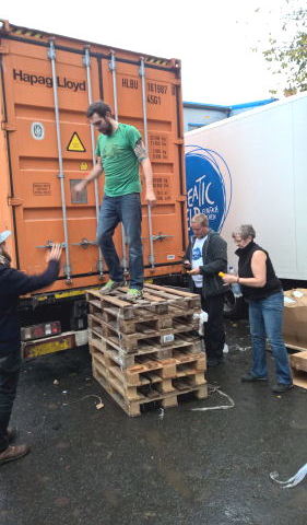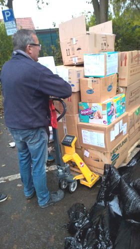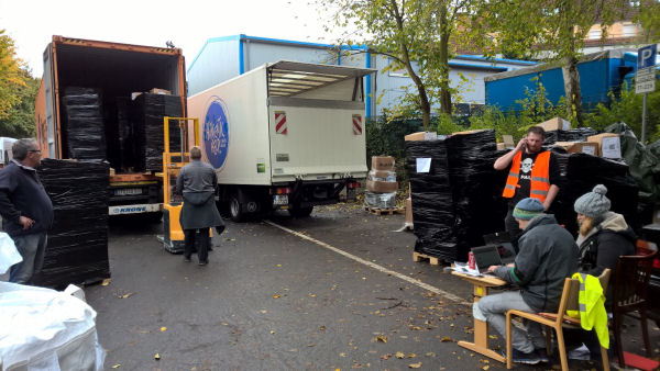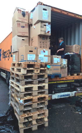 … diesen Stapel, von dem schon drei Kartons abgestürzt sind (die, da feucht geworden, ausgepackt und zurück „in die Elbe“, d.h. ins Hauptlager Große Elbstraße 264 gebracht werden müssen) so hoch zu hieven, dass man die Kartons verladen kann. Die Kartons müssen im Container gegeneinander abgestützt werden – |