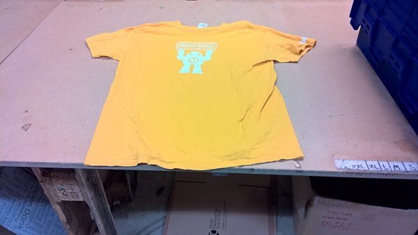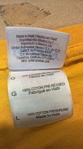 Hamburg, Große Elbstr. 264, Hanseatic Help Überall stapeln sich die Kisten – ich hab den Eindruck, man braucht mehr Helfer, um das Gespendete zu sortieren, als noch mehr neue Spenden an Kleidern usw. (OK, die auch) – JEDER KANN MITMACHEN ! Mehr auf der „Hansi“-Homepage: https://www.hanseatic-help.org/ Ich selber bin wieder in meiner Männerecke, räume in Kisten ein, packe Abgezähltes wieder von den Kisten in Kartons um, klebe sie zu, versehe sie mit einem Zettel wie z. B. „Männer: Pullover, Jacken ohne Hoodies (Kapuzen) Größe M 30 Stück“ und staple den Karton auf einem Wagen. Nach einer Stunde beginne ich mein Kreuz zu merken, aber das ist aushaltbar. Immer wieder lange Sucherei an der Krageninnenseite nach einer Größenangabe. Zum Bespiel an einem T-Shirt mit nichtssagendem Aufdruck. Aber das Schild fällt mir auf: Made in Haiti: |